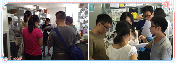 收集好血液樣本后, 每個(gè)小組根據(jù)protocol開始實(shí)驗(yàn)操作,指導(dǎo)人員對(duì)關(guān)鍵步驟進(jìn)行說明并進(jìn)行演示,如加樣,溶紅,加抗體混勻,洗滌,避光孵育等步驟。