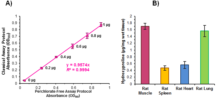 Figure (A). 經(jīng)典高氯酸法檢測(cè)的試劑盒(k555-100)和無(wú)高氯酸法檢測(cè)試劑盒(k266-100)的標(biāo)準(zhǔn)曲線(xiàn)之間的相關(guān)性比較。數(shù)據(jù)顯示此兩種檢測(cè)方法具有非常好的相關(guān)性(R2 > 0.999)。 (B). K266-100試劑盒檢測(cè)大鼠樣本中的總羥脯氨酸的含量。