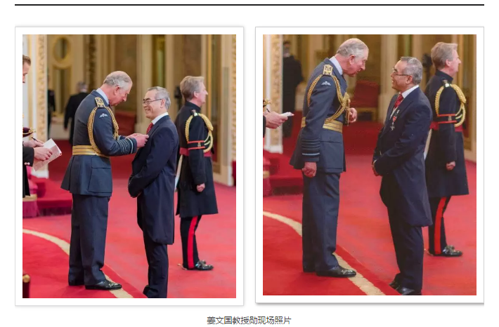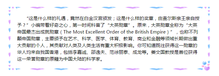 2017年3月16日,英國卡迪夫大學的華人科學家姜文國教授在倫敦白金漢宮接受了英國王儲查爾斯親王親自授予的2017年度“大英勛章”,表彰其在“國際癌癥研究方面的突出貢獻”, 成為首位獲得這一榮譽勛章的原籍為中國大陸的科學家。