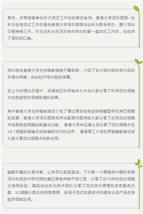 第二日的十色實操日程中,在達科為流式技術(shù)團隊指導(dǎo)下,每位參加的學(xué)員均有機會自己操作前期染色和后期數(shù)據(jù)處理,并且由深圳先進院的詹五根老師演示上機,大家收獲頗豐,參與學(xué)員人數(shù)達到40余人。