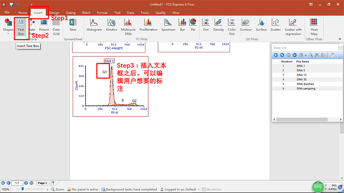 b.將細(xì)胞周期分析的模板調(diào)出來之后,點擊OK,會彈出如下圖所示的界面,然后可以利用insert按鈕,插入文本框,從而可實現(xiàn)圖注的編輯,如下圖所示(我們可以對圖中的每個峰進(jìn)行命名,從而可以對細(xì)胞周期中的各個時期進(jìn)行命名和解釋):