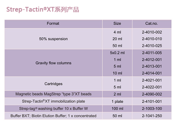 Strep-tag?是IBA lifesciences基于生物素(Biotin)和鏈霉親和素(Streptavidin)之間的結(jié)合反應(yīng)開發(fā)的蛋白純化系統(tǒng)。第三代Strep-tag?系統(tǒng):「Strep-Tactin?XT:Twin-Strep-tag?」蛋白純化系統(tǒng),其結(jié)合力可達(dá)pM級別但仍保持結(jié)合的可逆性和固定化蛋白的溫和復(fù)蘇能力。因此,用Strep-Tactin?XT系統(tǒng)能有效提高您目標(biāo)蛋白的純度,解決您實(shí)驗(yàn)中所遇到的常見問題。