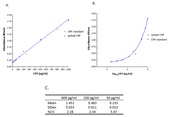 計算:擬合標準曲線,通過測量吸光度來確定添加到板中的樣品的CRP濃度。