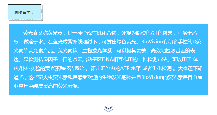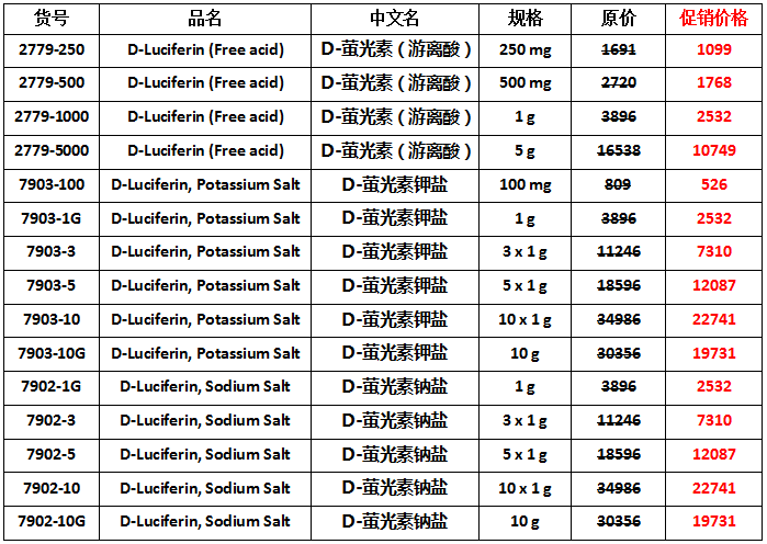 英文名:D-Luciferin (Free acid) 、D-Luciferin(Potassium Salt)、D-Luciferin( Sodium Salt)