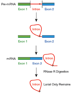 隨著環(huán)狀RNA的深入研究,環(huán)狀RNA制備問題就越來越備受關(guān)注。Lucigen提供大腸桿菌來源的RNase R,是一種Mg依賴性的3’ →5’核糖核酸外切酶,能消化基本上所有線性RNA,但不消化套索或環(huán)狀RNA的結(jié)構(gòu),或者3’突出短于7個核苷酸的雙鏈RNA。即是除了tRNA,5S RNA和內(nèi)含子套索結(jié)構(gòu)外,大多數(shù)細胞RNA都將被RNase R完全消化。如圖4,RNase R可從總RNA中分離出內(nèi)含子前體mRNA剪切產(chǎn)生的套索RNA。以這種方法獲得的RNA作為模板來生產(chǎn)標(biāo)記的cDNA,可作為含有潛在的內(nèi)含子序列的微陣列的目標(biāo),或者用于包含完整的染色體或者基因組的重疊區(qū)域平鋪陣列。產(chǎn)生的cDNA不代表線性內(nèi)含子,但其含有的序列是來源于內(nèi)含子的。