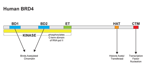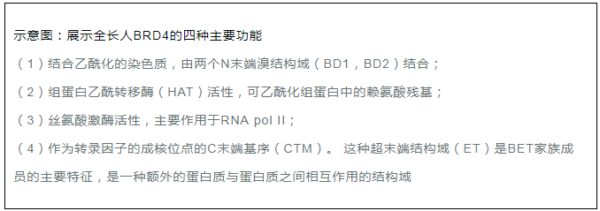 溴結(jié)構(gòu)域蛋白的BET家族的主要特征是它們都存在兩個(gè)溴結(jié)構(gòu)域和一種超末端(ET)結(jié)構(gòu)域2,6。其中,BRD4是研究較深入的。 BRD4具有四個(gè)主要的分子功能:(i)可以通過(guò)結(jié)合乙?;M蛋白維持染色質(zhì)結(jié)構(gòu),這種活性是由它的N-末端結(jié)構(gòu)域中的位點(diǎn)調(diào)控的; (ii)可以通過(guò)其HAT催化結(jié)構(gòu)域發(fā)揮組蛋白乙酰轉(zhuǎn)移酶(HAT)活性2,6; (iii)絲氨酸激酶活性,主要作用于RNA pol II;(iv)C端結(jié)構(gòu)域,可以發(fā)揮轉(zhuǎn)錄因子和復(fù)合物的結(jié)合和成核位點(diǎn)。研究發(fā)現(xiàn),BRD4常出現(xiàn)在幾種轉(zhuǎn)錄復(fù)合物,包括常見(jiàn)的輔因子調(diào)控子和P-TEFb 延伸因子6。 其C端結(jié)構(gòu)域也可以調(diào)控BRD4與許多眾所周知的轉(zhuǎn)錄調(diào)節(jié)因子之間的相互作用,顯著的有:P-TEFb,MYC,NFκb 以及p532,4,6-8等。