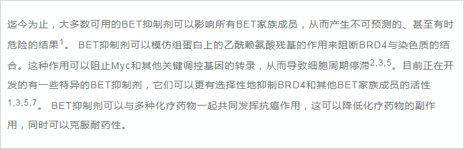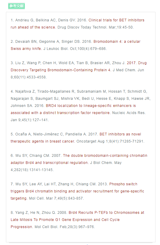 BRD4(溴結(jié)構(gòu)域蛋白4)是一種轉(zhuǎn)錄調(diào)節(jié)因子。研究發(fā)現(xiàn),BRD4在癌癥、自身免疫和炎癥性疾病中具有重要的作用1,2。 正常生理情況下,BRD4主要參與細(xì)胞周期過(guò)程中的基因表達(dá)調(diào)控,其可以與乙?;旧|(zhì)結(jié)合,保持各種基因在細(xì)胞分裂循環(huán)過(guò)程中的穩(wěn)定表達(dá) ,這種現(xiàn)象被稱為表觀遺傳記憶或基因轉(zhuǎn)錄的“書(shū)簽”2,7。 同時(shí),BRD4在調(diào)控分化和發(fā)育中也起著關(guān)鍵作用2,4。 如果BRD4缺失,骨髓干細(xì)胞將不能分化成為B和T細(xì)胞2。 BRD4亦是MEFs或B細(xì)胞重編程為誘導(dǎo)多能干細(xì)胞過(guò)程中重新表達(dá)干細(xì)胞基因所必需的,在成骨細(xì)胞分化過(guò)程中BRD4也發(fā)揮重要作用。 綜上,BRD4在細(xì)胞周期調(diào)控和分化中的重要作用使其成為癌癥和免疫系統(tǒng)疾病的新興治療靶點(diǎn)。