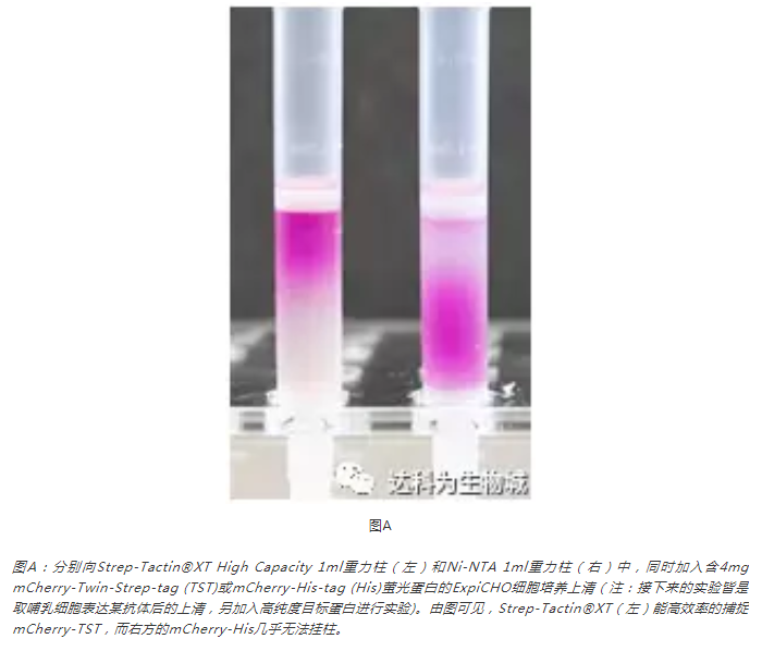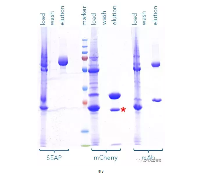 此外,我們也測試了其他的蛋白,例如SEAP(72 kDa)或抗體(mAb,其重鏈為55kDa)。圖B為以Strep-Tactin?XT純化SEAP-TST、mCherry-TST與mAb-TST的SDS-PAGE分析結(jié)果,可見對于不同蛋白,Strep-tag?系統(tǒng)都能純化出高純度的目標蛋白。(注:紅色標記處為 mCherry的降解產(chǎn)物,非雜帶)