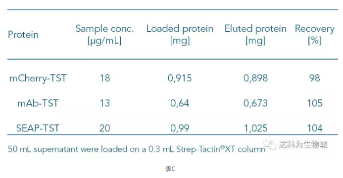 因Strep-Tactin?XT與Twin-Strep-tag蛋白的高親和力,即使目標蛋白的濃度低,使用Strep-Tactin?XT仍可以有效的捕捉上清中的目標蛋白。表C整理了幾個實驗的數(shù)據(jù),顯示當目標蛋白濃度低于20μg/ml時,得率仍能達到幾近100%。