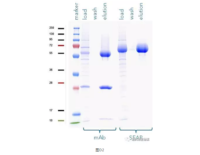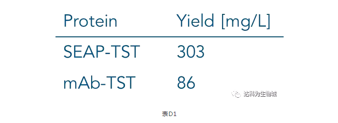 除了上述實驗所用的CHO細胞株外(中國倉鼠卵巢細胞),另一常用于生產(chǎn)蛋白的哺乳動物細胞株為HEK293(人胚胎腎細胞),使用上較CHO簡單。我們測試了Strep-Tactin?XT的純化表現(xiàn):表D1為以Expi293表達SEAP-TST或mAb-TST蛋白后,目標蛋白的濃度。圖D2為純化表現(xiàn)的SDS-PAGE分析。從中可知,與ExpiCHO培養(yǎng)基相同,直接將表達好的Expi293上清加入1ml Strep-Tactin?XT高載量重力柱中進行純化,一樣能夠快速的得到高純度的目標蛋白。