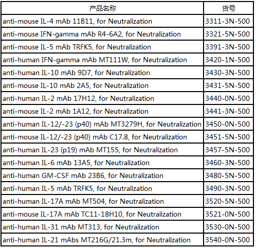 Mabtech除了ELISpot、ELISA相關(guān)檢測(cè)產(chǎn)品外,還提供人、小鼠等多種指標(biāo)的中和抗體;并且Mabtech的中和抗體均為單克隆抗體,不含疊氮化鈉,且內(nèi)毒素含量均低于10 EU/mg。