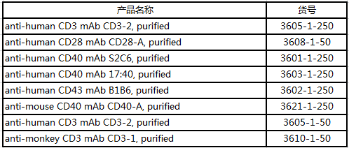此外,Mabtech還推出了能夠刺激T、B細(xì)胞激活的抗體,如:Anti-CD3可作為T(mén)細(xì)胞多克隆活化劑;Mabtech提供了人和猴的CD3單克隆抗體,它能激活多種細(xì)胞因子的釋放,包括IFN-γ、IL-2、IL-4、IL-5、IL-10、IL-13和IL-17A。