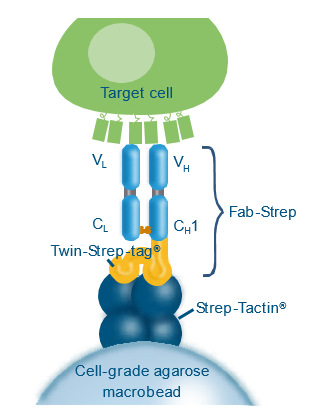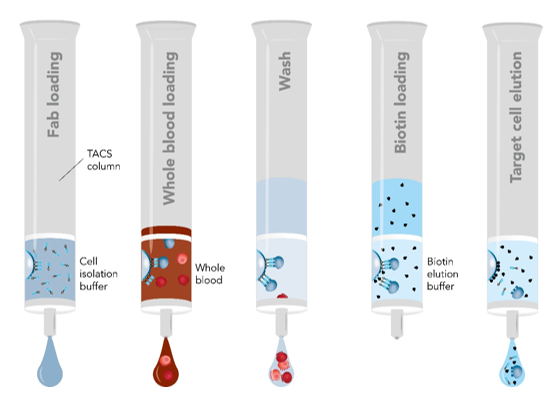 Fab-TACS柱子填充了包被有Strep-Tactin? 多聚體的細(xì)胞級瓊脂糖基質(zhì),偶聯(lián)上Strep-tag的Fab片段(Fab-Streps)特異性的結(jié)合到瓊脂糖基質(zhì)上。隨后,加入全血或其他血液制劑流過柱子。目的細(xì)胞通過特異性的與Fab-Streps作用從而結(jié)合到瓊脂糖基質(zhì)上,其他非目的細(xì)胞則有效的被洗去。最后,加入生物素使目的細(xì)胞從Fab-Streps上解離。至此,就已分離得到不帶任何標(biāo)記的、真實(shí)的目的細(xì)胞可用于下游的實(shí)驗(yàn)研究。