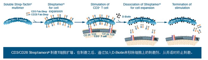 Streptamers?應(yīng)用于T細(xì)胞擴(kuò)增是目前T細(xì)胞擴(kuò)增術(shù)中一項(xiàng)較新穎的技術(shù)。該技術(shù)的核心在于:將抗CD3和抗CD28的Fab-Streps結(jié)合到Strep-Tactin? 多聚體上,使它們形成可溶性的蛋白復(fù)合物。在刺激之后,通過加入D-Biotin來移除細(xì)胞上的刺激劑,從而適時(shí)終止刺激。