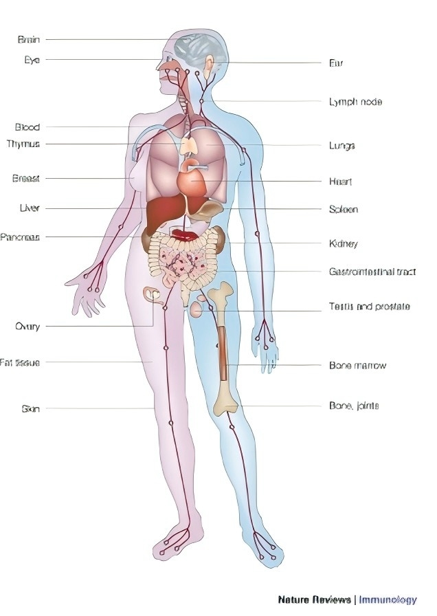 起初,T 細胞被認為是免疫系統(tǒng)中 MIF 的主要細胞來源。然而,后來的文獻證明了單核細胞、巨噬細胞、血液中的樹突狀細胞、B 細胞、中性粒細胞、嗜酸性粒細胞、肥大細胞和嗜堿性粒細胞均表達MIF。值得注意的是,MIF 也由與宿主自然環(huán)境直接接觸的細胞和組織表達,例如肺、皮膚上皮層以及胃腸道和泌尿生殖道。其另一個顯著特征是在內(nèi)分泌系統(tǒng)的幾個組織中高水平表達,尤其是參與應(yīng)激反應(yīng)的器官(下丘腦、垂體和腎上腺)。
