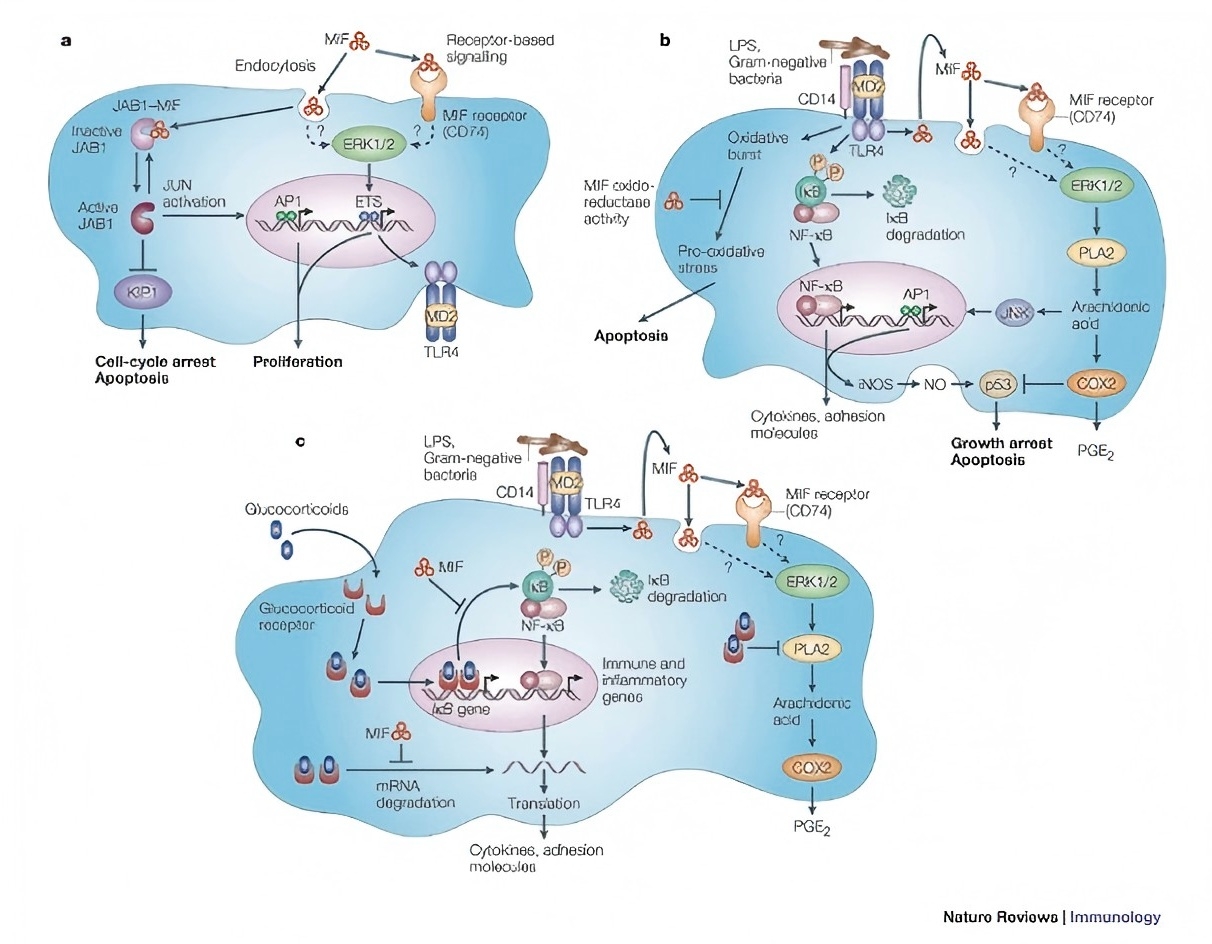 當用 LPS 刺激時,巨噬細胞釋放 MIF。免疫細胞的其他促炎效應(yīng)分子,如 TNF 和 IFN-γ,也是巨噬細胞產(chǎn)生 MIF 的強誘導(dǎo)劑。MIF 在組織或體循環(huán)中釋放后,作為一種經(jīng)典的促炎細胞因子,通過激活巨噬細胞和 T 細胞來促進先天性和適應(yīng)性免疫反應(yīng)。