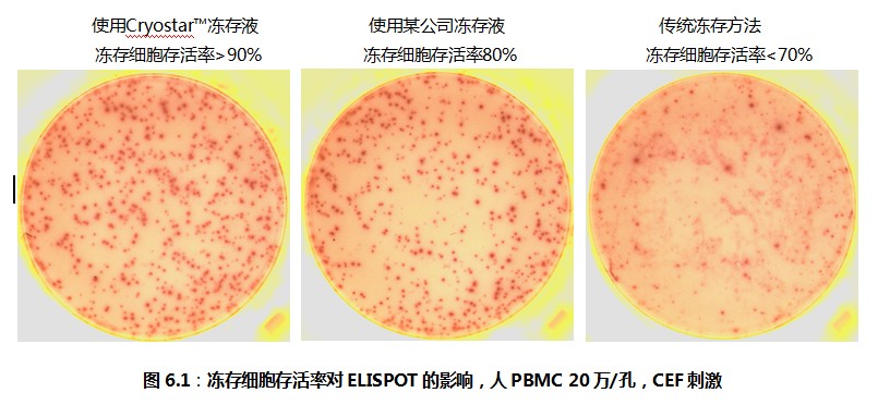 考慮到ELISPOT檢測的特殊性,荷蘭U-CyTech公司經(jīng)過精心的研究與反復(fù)的驗證,推出了Cryostar?凍存試劑盒,在凍存液中添加了一系列對細(xì)胞有特殊保護作用的保護劑。達科為公司在接到Cryostar?凍存試劑盒之后,在我們的實驗室以及國內(nèi)數(shù)家客戶的實驗室做了細(xì)胞凍存與復(fù)蘇的實驗,并且對復(fù)蘇之后的細(xì)胞做了ELISPOT檢測。結(jié)果表明,淋巴細(xì)胞的存活率超過90%,ELISPOT斑點形成頻率與新鮮細(xì)胞完全相同。參見圖6.1。
