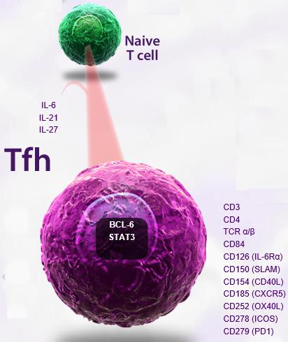 主要標記物:Tfh 細胞屬于 CD4+ T 細胞亞群,其表型特征為 CXCR5+CD40LhiICOShi ,并且還表達細胞因子 IL-21 和轉錄因子 Bcl-6 。 IL-21 和 Bcl-6 ( B-cell lymphoma 6 )對于 Tfh 細胞的發(fā)生和發(fā)育至關重要。其中 IL-21 誘導 Tfh 的分化并促進其表面 CXCR5 的表達; Bcl-6 對于 Tfh 轉移到淋巴濾泡和 B 細胞發(fā)生中心( Germinal center )的形成必不可少。