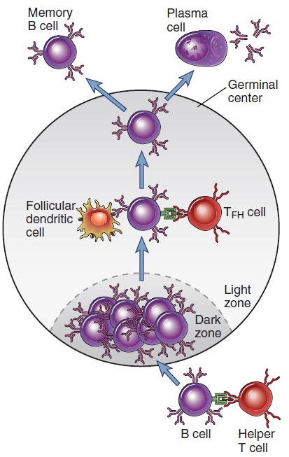 Tfh 細胞的主要作用是增加高親和力 B 細胞和長壽漿細胞的形成,并幫助他們轉移到發(fā)生中心(GC)。在接受抗原刺激后,初始 B 細胞首次移動到 T 細胞區(qū),且在來自 Tfh 細胞和抗原呈遞細胞的共刺激作用下開始活化并形成發(fā)生中心。當發(fā)生中心的 B 細胞開始分化為漿細胞或記憶 B 細胞時, Bcl-6 會阻止 B 細胞的增殖,因為 Bcl-6 可以抑制 B 細胞活化基因的表達,如 CD69、 STAT1 和 CD80 等,同時也會通過調節(jié) Prdm1 來抑制發(fā)生中心的 B 細胞向漿細胞分化。 Tfh 細胞通過 CD40 的作用致使 Bcl-6 轉錄沉默,從而促使發(fā)生中心 B 細胞存活和增殖。且在這一過程中,CD40L、PD-1、BAFF、IL-4 和 IL-21 等信號分子的參與也是必不可缺的。
