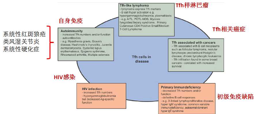 因此,基于 Tfh 細胞的功能特性,其與多種疾病密切相關。 Tfh 細胞及相關分子的缺陷會導致正常的 B 細胞反應不能完成,產生體液免疫缺陷。相反, Tfh 功能亢進也會導致病態(tài)的自身免疫反應,介導自身免疫病的發(fā)生。目前對 Tfh 的研究也主要集中在其與自身免疫疾病和 HIV 的關系上面。