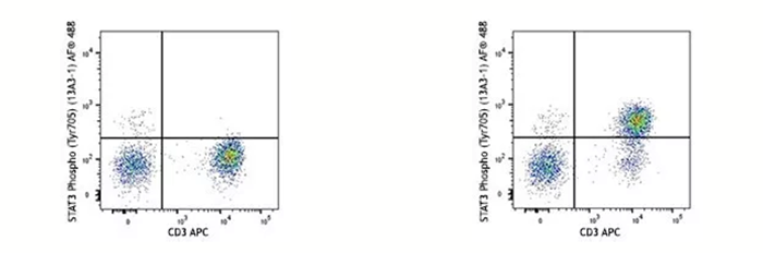 在蛋白翻譯后修飾(磷酸化、乙?;?、甲基化等)的研究過程中,固定劑不僅可以有效的“固定”住翻譯后修飾的位點(diǎn)(絲氨酸、蘇氨酸、酪氨酸等),也可以防止目標(biāo)位點(diǎn)在活細(xì)胞中很快降解(比如磷酸酶會(huì)去除磷酸化修飾、去甲基化酶會(huì)移除甲基化修飾等)。下面的例子是用IL-6的重組蛋白刺激人外周血15分鐘后看STAT3第705位酪氨酸的磷酸化水平,在刺激完樣本后就需要通過固定來實(shí)現(xiàn)目的氨基酸磷酸化水平“停留”在IL-6刺激15分鐘這個(gè)節(jié)點(diǎn)上。
