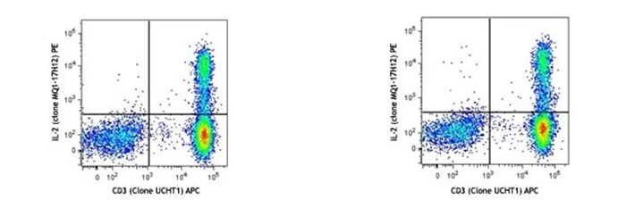 左圖:human PBMC刺激完當(dāng)天染色后上機(jī)檢測;右圖:同一樣本,表染和固定后,保存在Cyto-Last? buffer里面,14天后做胞內(nèi)染色并上機(jī)。
