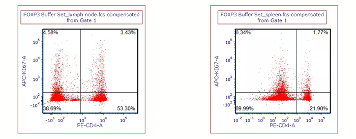 用BioLegend FOXP3 Buffer set對細(xì)胞進(jìn)行固定破膜處理后,染Ki-67抗體,左圖:小鼠淋巴結(jié)樣本;右圖:小鼠脾臟樣本。