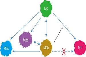 不同類型巨噬細胞的表型轉(zhuǎn)換。M0型巨噬細胞可以在不同誘導劑的作用下極化為M1或M2(M2a、M2b、M2c)。M2b型巨噬細胞可以在不同刺激下轉(zhuǎn)換為M2型巨噬細胞的其他亞型。值得注意的是,M2b型巨噬細胞抑制從M0到M1的轉(zhuǎn)換。此外,在M1刺激劑的條件下,M2b型巨噬細胞不能重新極化為M1型。