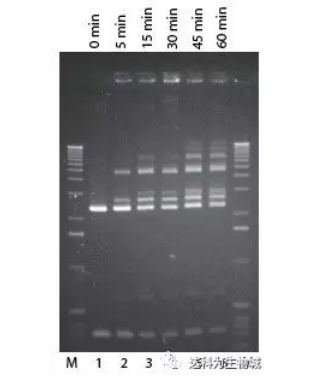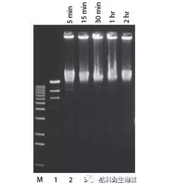 pUC 19 DNA用Pvu II消化,然后按標(biāo)準(zhǔn)連接反應(yīng)使用2U Fast-Link? ligase進(jìn)行連接(泳道1-6). 泳道 M,1-kb ladder;泳道1,無酶對(duì)照;泳道2-6, 分別為5 min, 15 min, 30 min, 45min, 1 hr連接結(jié)果。