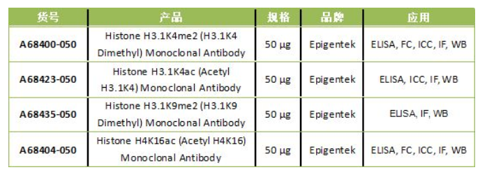 Epigentek提供多種新型兔單克隆抗體,用于表觀遺傳學研究。與傳統(tǒng)的小鼠單克隆抗體相比,這些抗體提供更高親和力,更高特異性,更好地識別抗原表位。