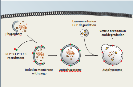自噬通過溶酶體將胞漿物質(zhì)降解,是維持恒定程序的基本要素。研究自噬潮(autophagicflux)的關(guān)鍵蛋白是LC3(微管相關(guān)蛋白1輕鏈3)。在分離膜形成時(shí)胞漿中的LC3被招募并進(jìn)入自噬程序,此定位動(dòng)作被視為自噬膜的特征,用以檢測(cè)自噬的生成和發(fā)展。由LC3B融合一個(gè)綠色熒光蛋白(GFP)和一個(gè)紅色熒光蛋白(RFP)組成的嵌合蛋白 ,是檢測(cè)自噬過程的簡(jiǎn)單方法。自噬體的形成可被RFP-GFP-LC3標(biāo)記,顯示RFP和GFP雙信號(hào)。與溶酶體融合后,酸性環(huán)境可顯著降低GFP信號(hào),RFP信號(hào)卻保持穩(wěn)定。隨著自噬研究熱度的不斷提高,自噬報(bào)告基因細(xì)胞作為自噬過程研究的工具越來越多的受到廣大科研工作者的關(guān)注。