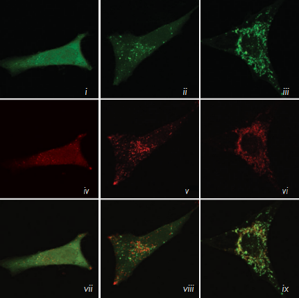 ☆HeLa-Difluo?hLC3細(xì)胞被25μM rapamycin 單獨(dú)處理或25μM rapamycin和 500nM bafilomycin A1(抑制自噬體和溶酶體融合)聯(lián)合處理。孵育24小時(shí),用2% PFA固定細(xì)胞,并用共聚焦顯微鏡分析結(jié)果。請(qǐng)注意在圖片viii中,黃色(自噬體)和紅色(自噬溶酶體)斑點(diǎn)均顯著提升,而圖片ix中的斑點(diǎn)幾乎均為黃色(自噬體)。